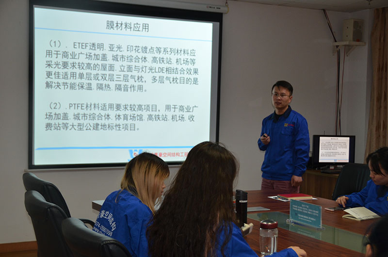 然后,我们的销售主管教员工们学习了膜材料分类、膜结构优势及应用领域、膜结构产品结构形式等。